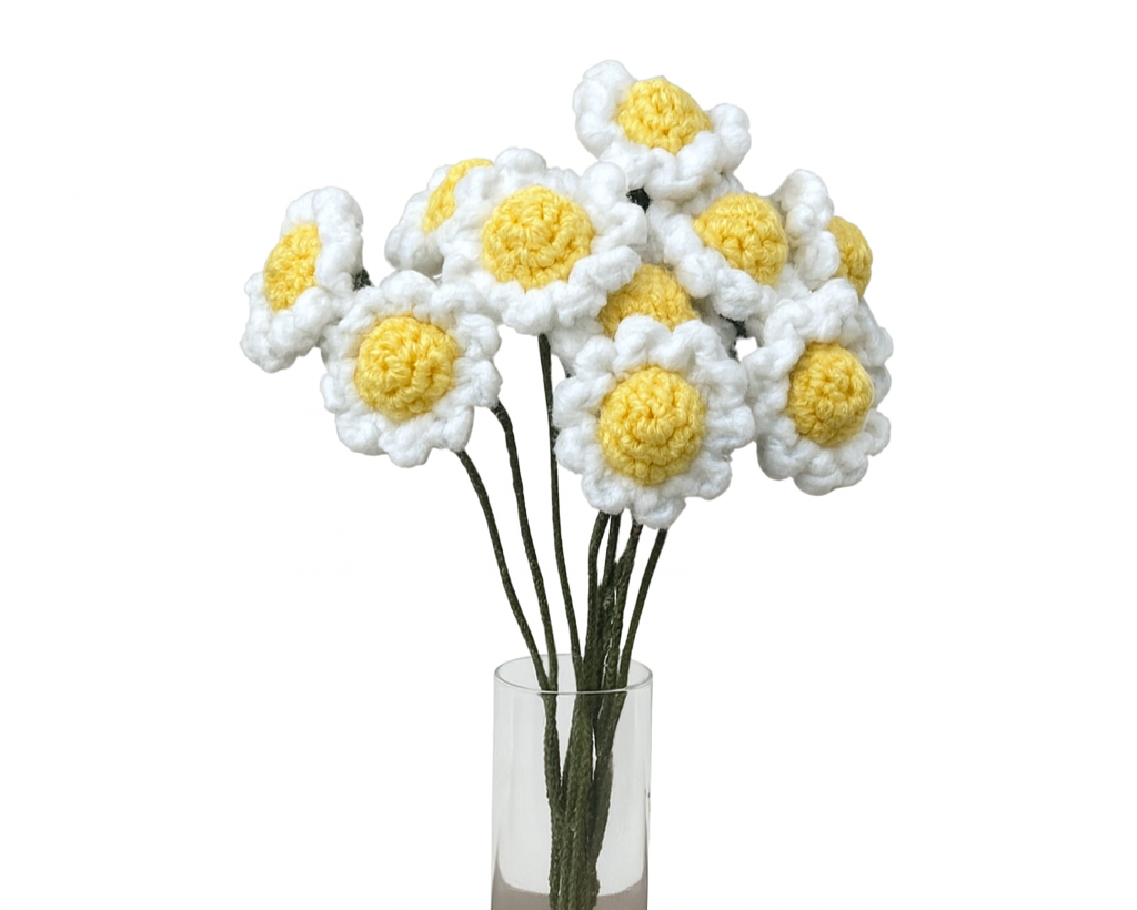 De madeliefjes zijn leuk als decoratie in huis, als accessoire of als handgemaakt cadeau. Combineer ze met andere bloemenpakketten uit onze collectie en stel je eigen unieke gehaakte boeket samen.